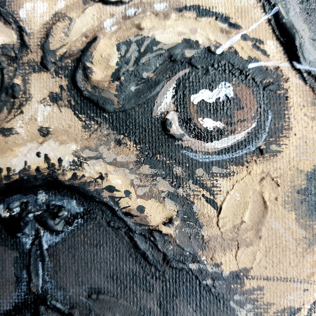 Mopsík na obraze má díky této pastě vystouplou vrásku nad čumáčkem, nadoční oblouky, uši a dalších pár místeček. Výtvarným médiem jsou kvašové barvy, které jsou nádherně syté a matné.