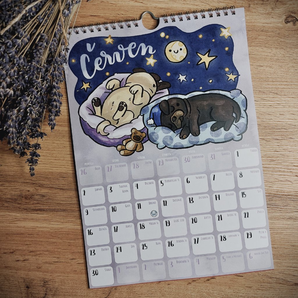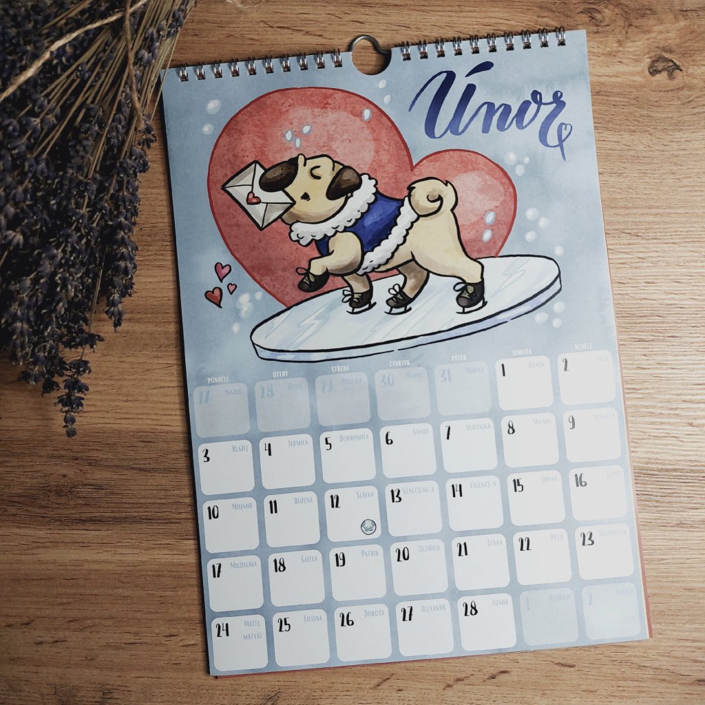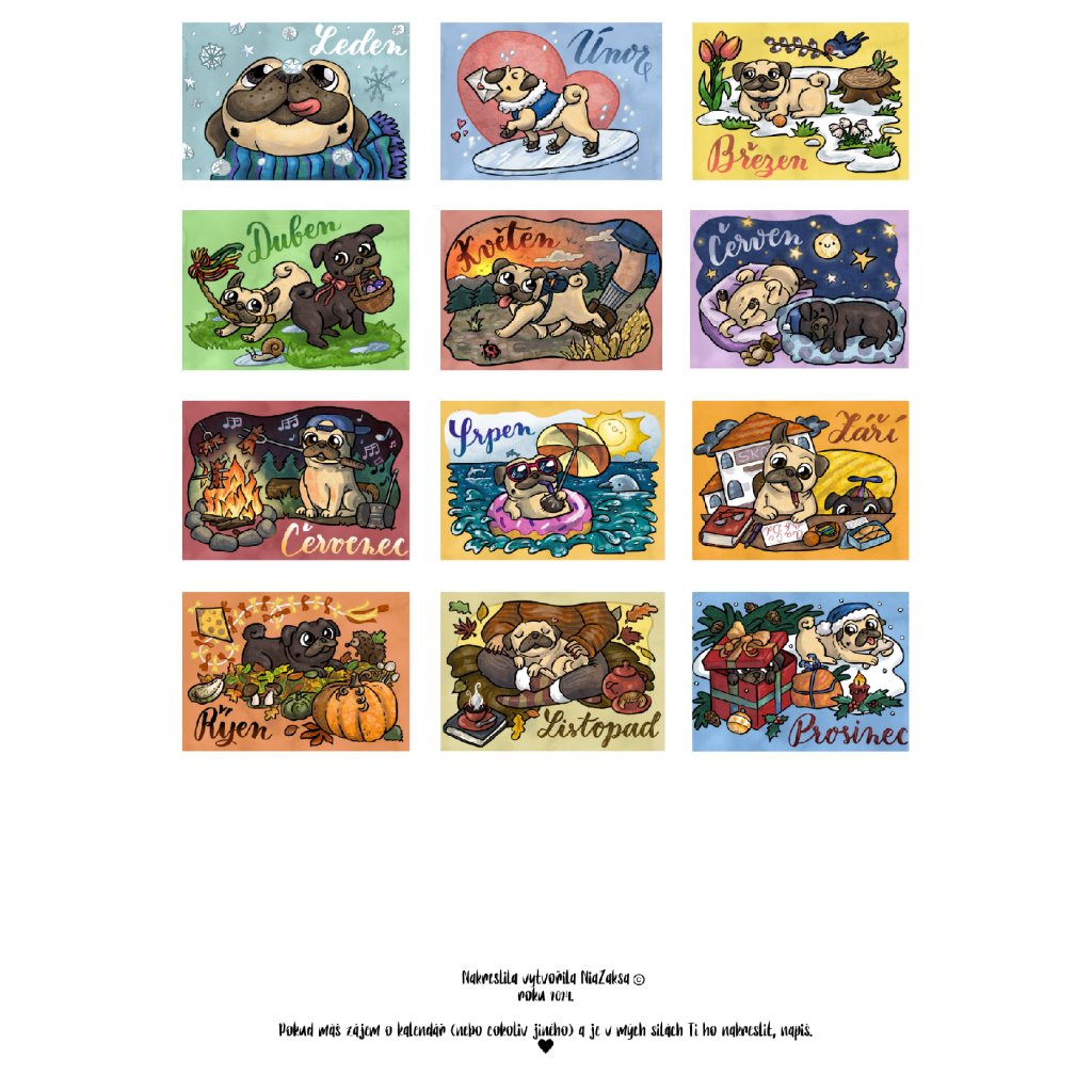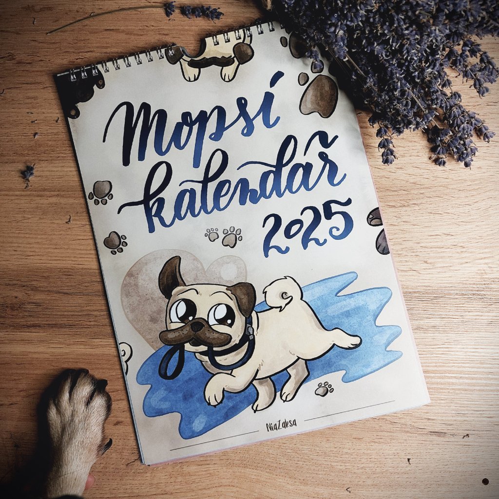 Veselý kalendář pro milovníky mopsíků s autorskými ilustracemi.