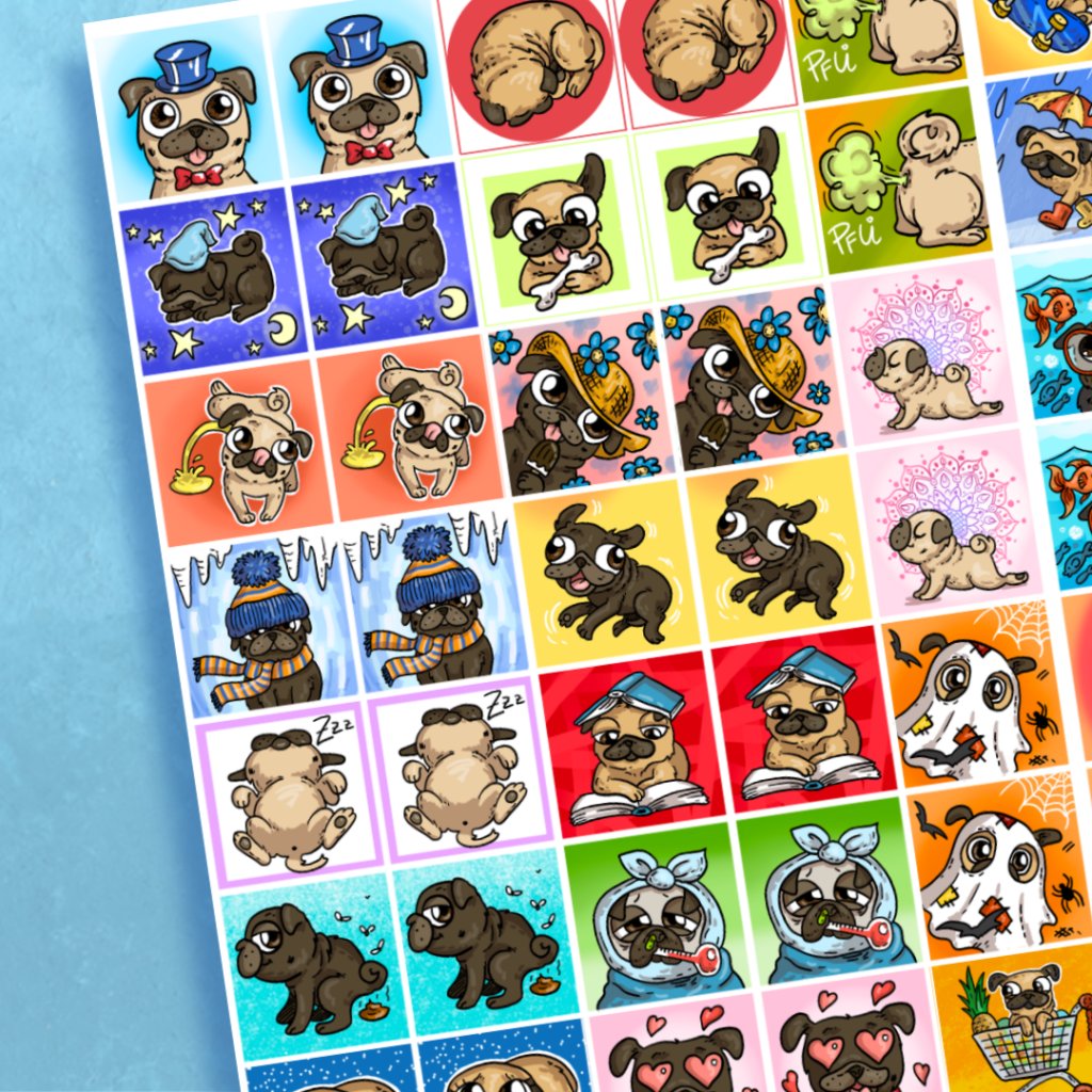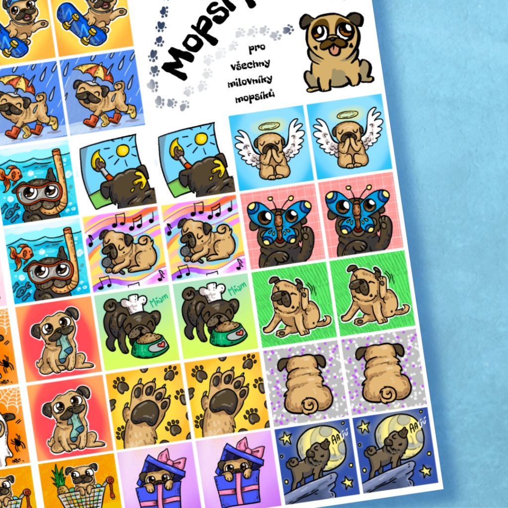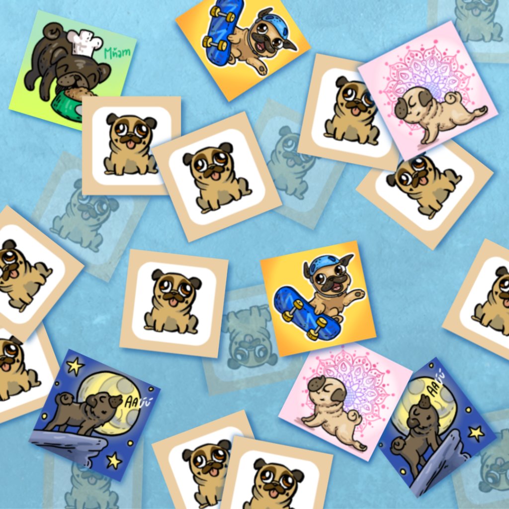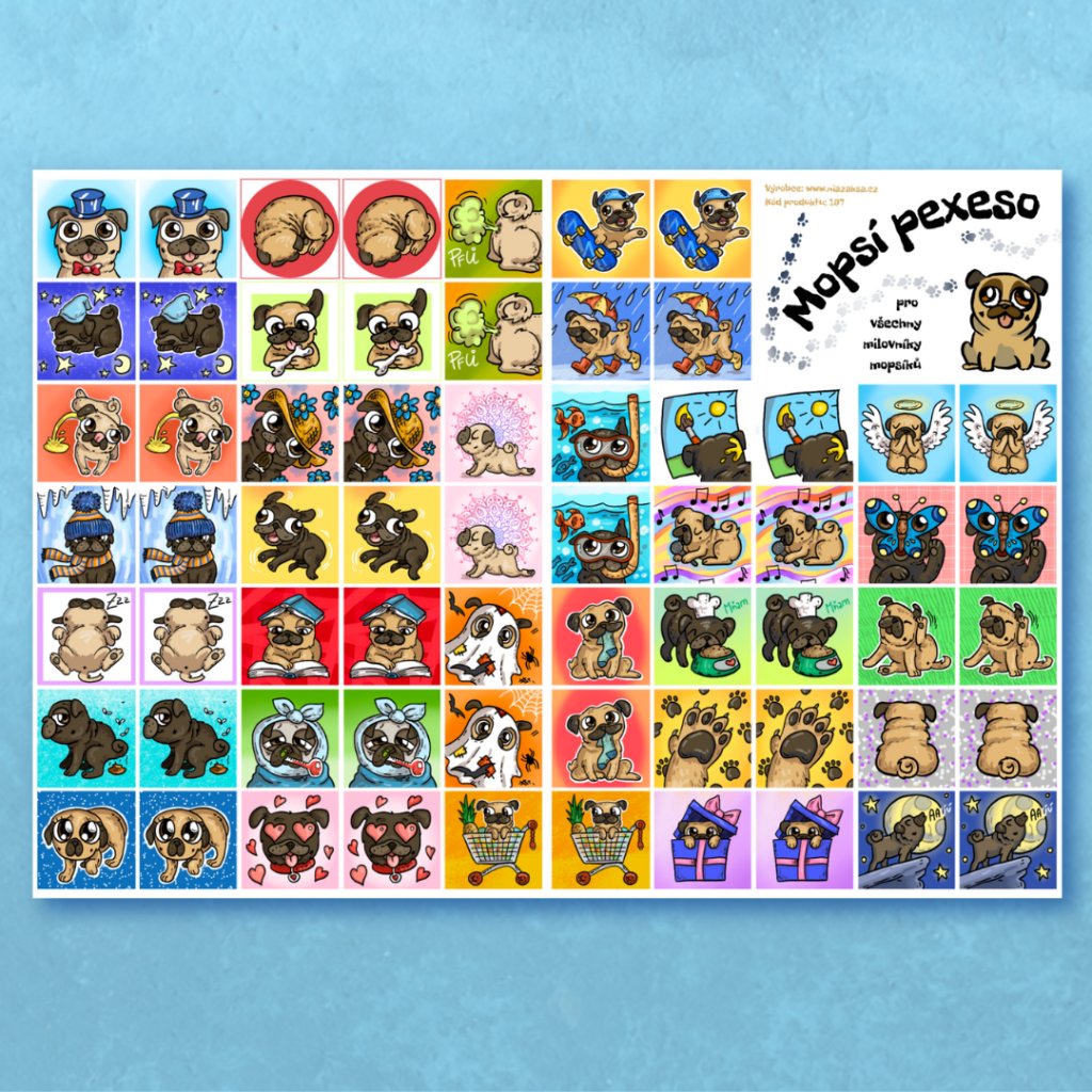 Tradiční pexeso pro všechny milovníky mopsíků. Počet párů 32, tj. 64 kartiček.