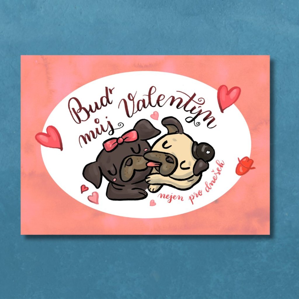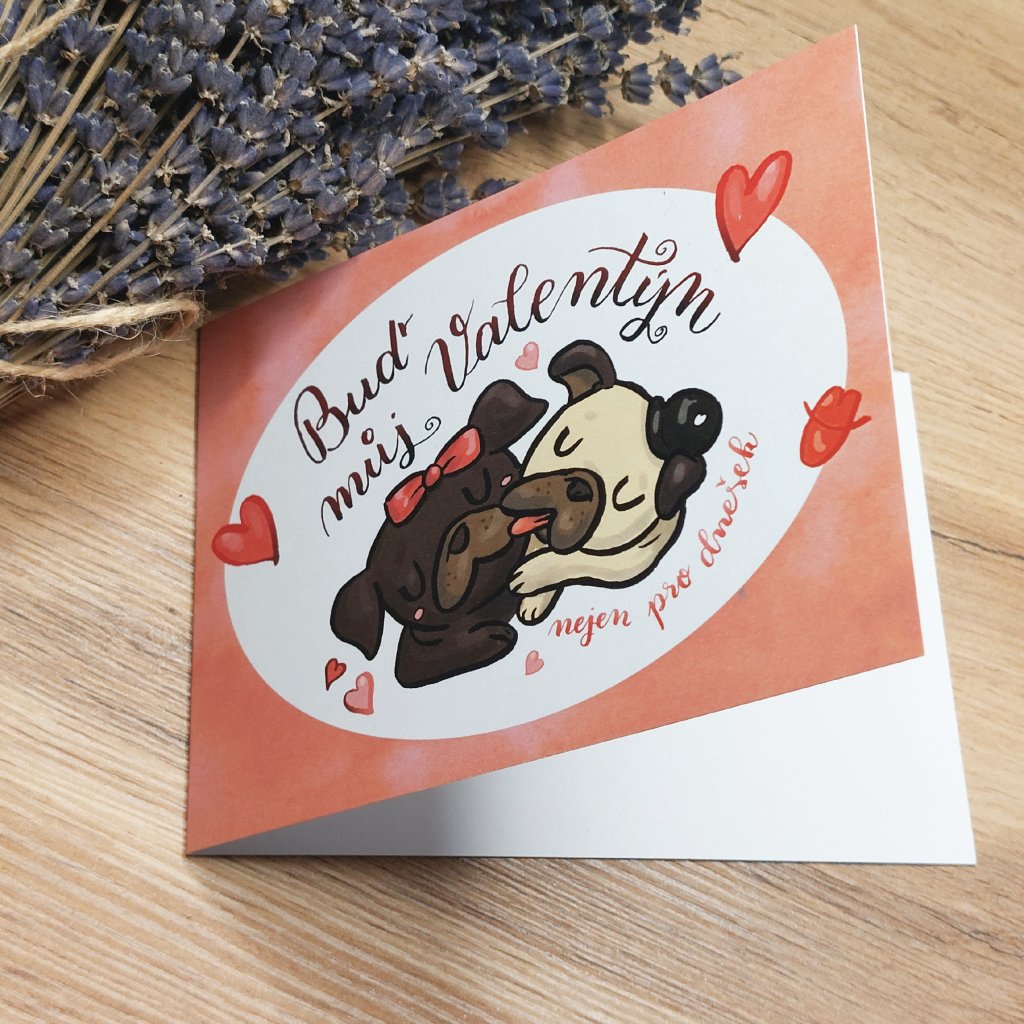 Valentýnské přáníčko A6 pro milovníky mopsíků. Otevírá se na kratší straně.