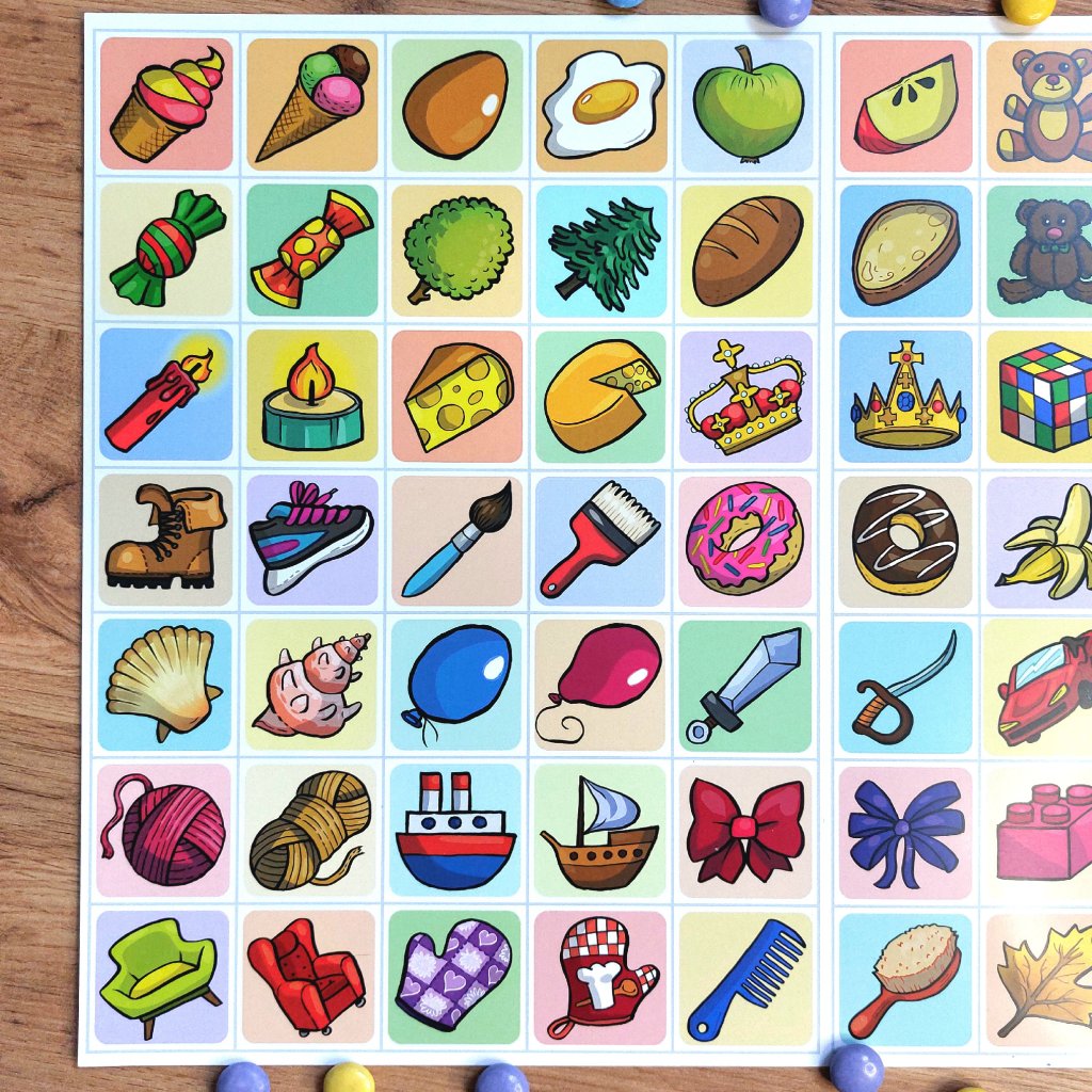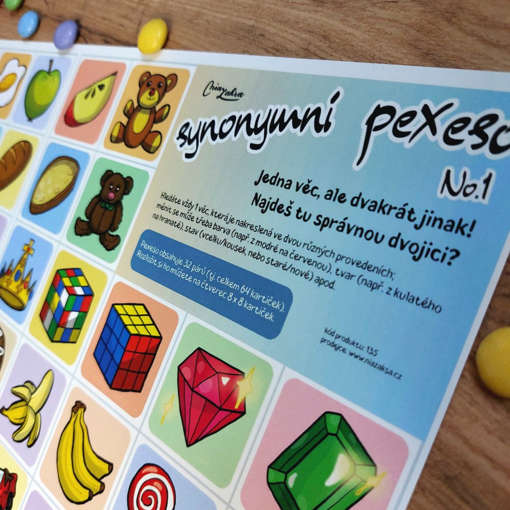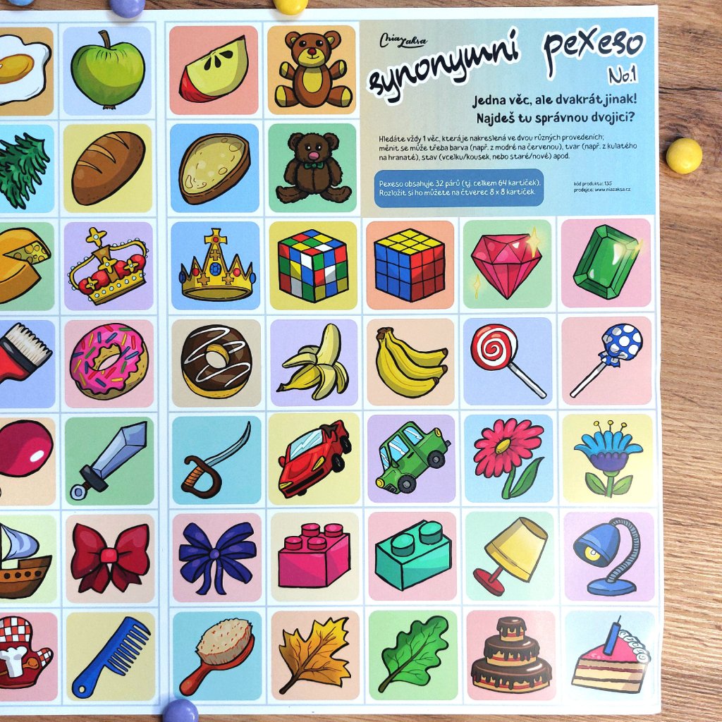 Nevěděla jsem, jak tenhle typ pexesa nazvat, a proto jsem jako správný češtinář sáhla do jazykové terminologie. Slovo synonymum v češtině znamená, že jeden jev je pojmenován dvěma různými slovy. V případě mého pexesa jsem jednu věc nakreslila dvěma různými způsoby. Děti (nebo i vy, hehe) musí dávat dvakrát větší pozor než obvykle, aby dokázaly najít správný pár.