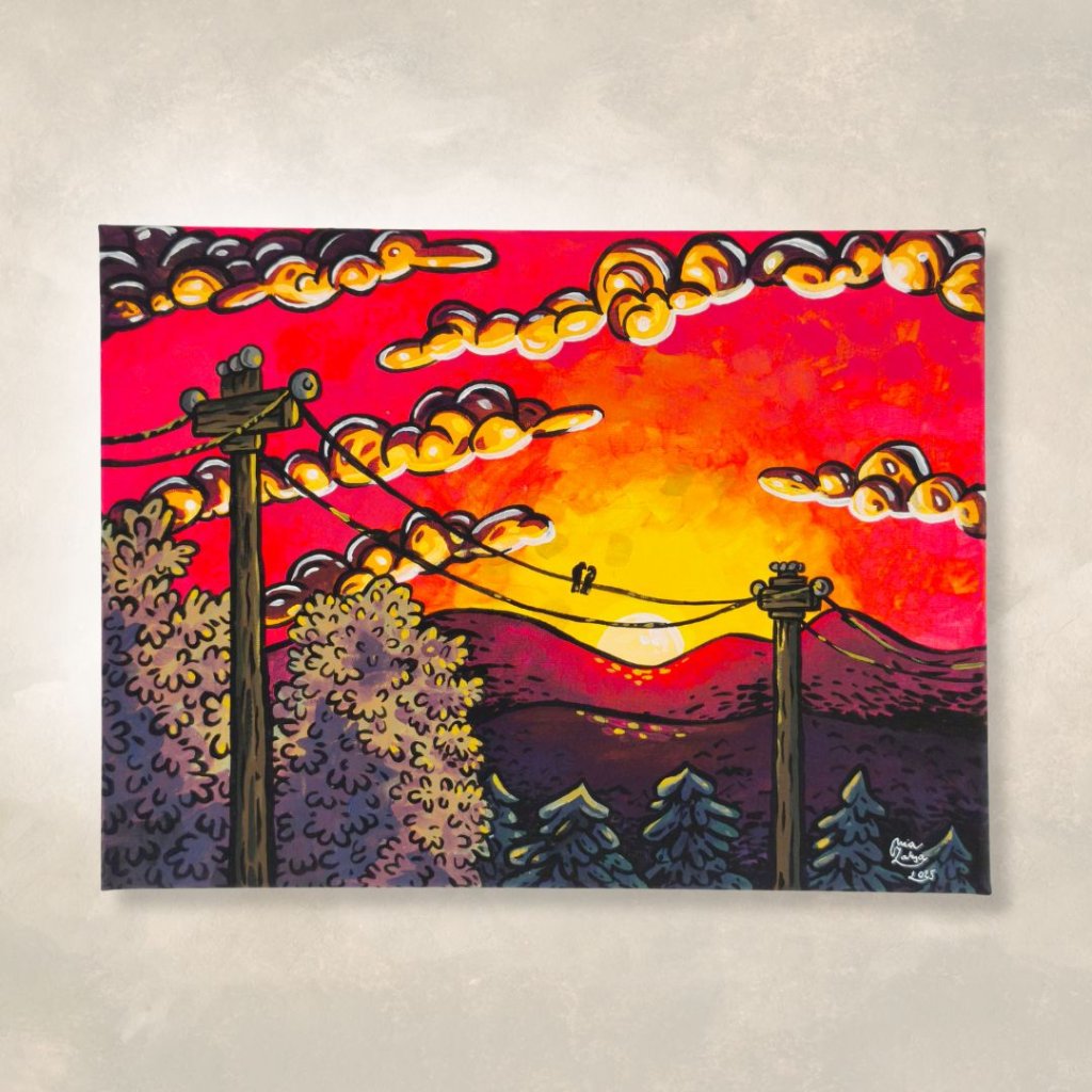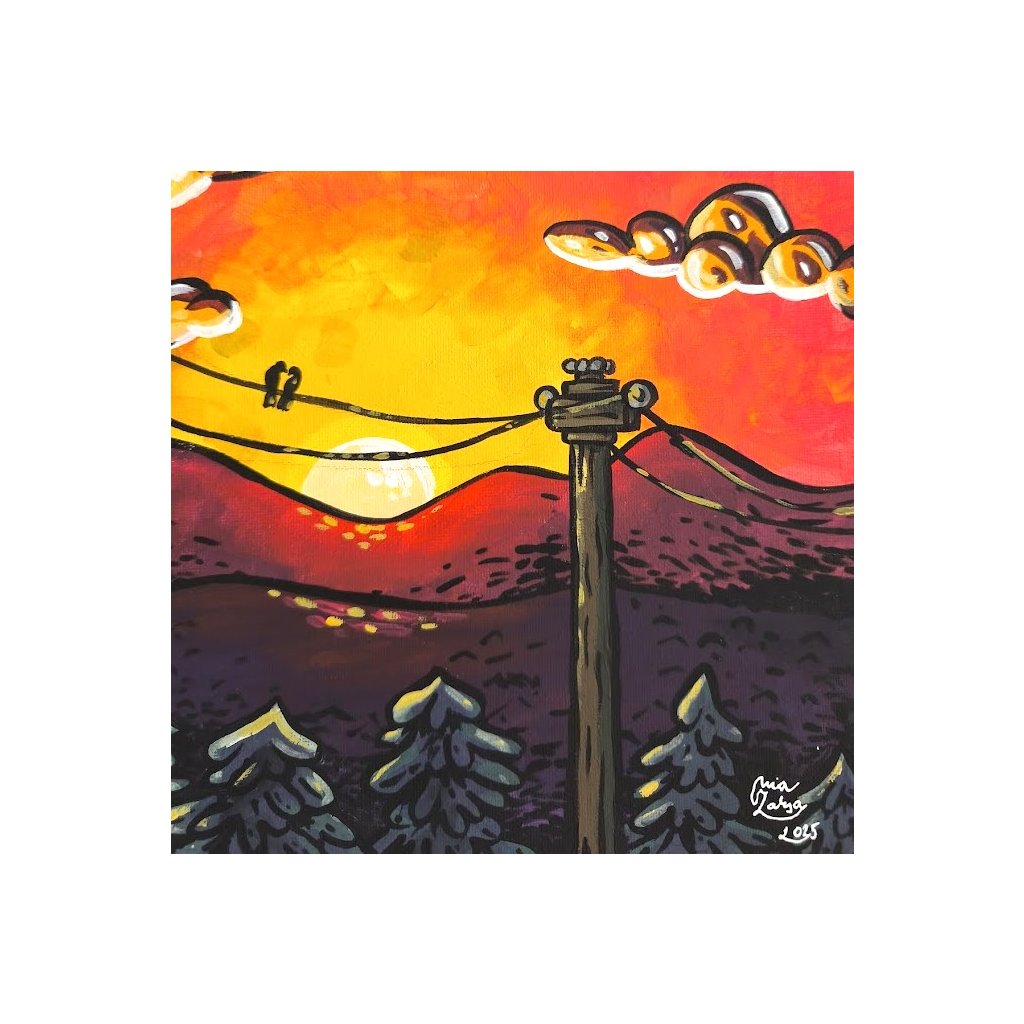 Komiksová scenérie se západem slunce na plátně o rozměrech 40 x 30 cm.